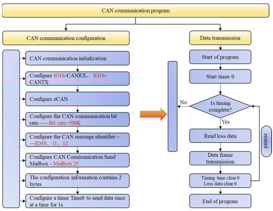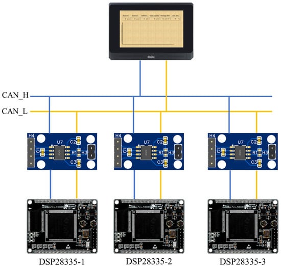 The architecture diagram of the CAN bus communication framework is shown in Figure 13. The TMS320F28335 core board connects the network node with the CAN bus network through the CAN communication module. There are four nodes in the CAN bus transmission network, three TMS320F28335 send loss data, and one serial port receives loss data.