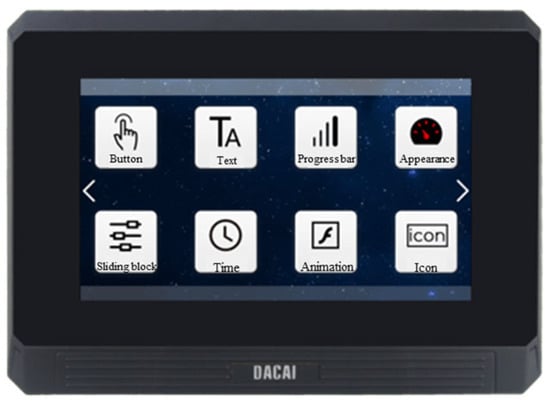 For man–machine interaction systems, hardware equipment serves as an essential carrier. In this paper, a serial display was used as the hardware component of the man–machine interaction system, which facilitates bidirectional information exchange between the single-chip computer and the system itself, as well as between the system and the drivers in a pairwise manner. By comprehensively evaluating the performance and features of serial display products from these and other companies and considering the specific design criteria for the human–computer interaction system discussed in this research, the serial screen produced by Guangzhou Dacai Optoelectronics Technology Co., Ltd. is selected, as shown in Figure 14. The technical specifications of this display model are summarized in Table 5.