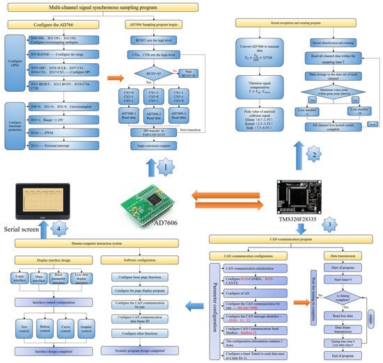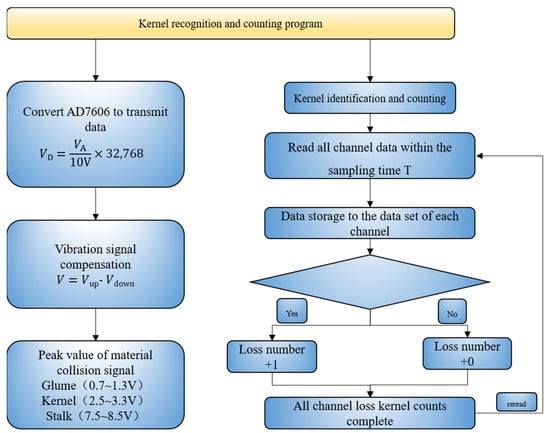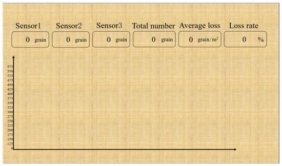 - The software design is based on the CCS integrated development environment and Visual TFT serial screen development software. The software design realizes the acquisition, identification, counting, and loss data transmission of wheat kernel collision signals; displays the cleaning loss data on the human–computer interactive system; and realizes the real-time monitoring of the cleaning loss of wheat combine. A multi-channel signal synchronous acquisition program was designed to collect signals from 23 output channels of a bidirectional array piezoelectric sensor and vibration signal compensation device at a sampling rate of 40 kHz, and SPI communication transmitted the collected data to the TMS320F28335 core processor for vibration signal compensation program processing. The kernel identification and counting program with the kernel collision signal peak value of 2.5 V~3.3 V as the index is completed. Finally, the data frames with ID values of 10, 11, and 12 are transmitted to the human–computer interaction system by CAN bus at a communication rate of 500 Kbps for loss data display. When the cleaning loss exceeds the regulation, the driver is reminded to adjust the operating parameters of the harvester to reduce the cleaning loss.