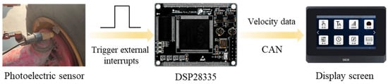 According to the monitoring requirements of the wheat combine harvester cleaning loss monitoring device, the hardware structure of the designed monitoring device is shown in Figure 3. It is mainly composed of a bidirectional array piezoelectric sensor, vibration signal compensation device, signal amplification module, AD7606 analog-to-digital conversion module, TMS320F28335 core processor module, CAN bus communication module, and serial port screen.