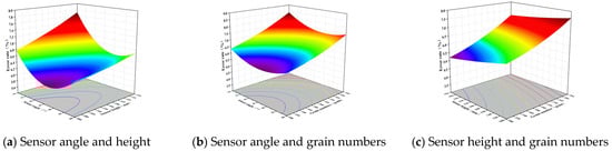 According to the response surface of the pair-to-pair interaction of test factors, it can be seen that when the monitored grain quantity is unchanged, the error rate decreases with the increase in sensor height and then decreases first and then increases with the sensor angle from 30° to 60°, as shown in Figure 31a. When the sensor height remained constant, the error rate increased with the increase in the number of grains and then first decreased and then increased with the sensor angle from 30° to 60°, as shown in Figure 31b. When the sensor angle is unchanged, the error rate increases with the increase in the number of grains and the decrease in the sensor height, as shown in Figure 31c.