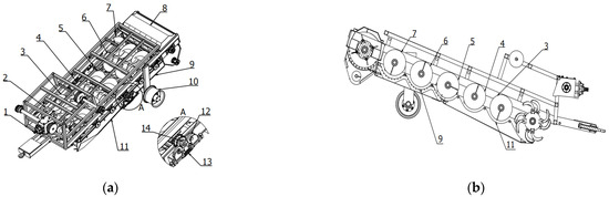 (a): Overall structure of the conveying and separating device. (b): the sectional drawing of the conveying and separating device. 1. Power shaft. 2. Rotary blade. 3. First-stage screw conveyor. 4. Second-stage screw conveyor. 5. Third-stage screw conveyor. 6. Fourth-stage screw conveyor. 7. Fifth-stage screw conveyor. 8. Collection box. 9. Back screen. 10. Tire. 11. Front screen. 12. Exciting roller. 13. Return Spring. 14. Exciter.
