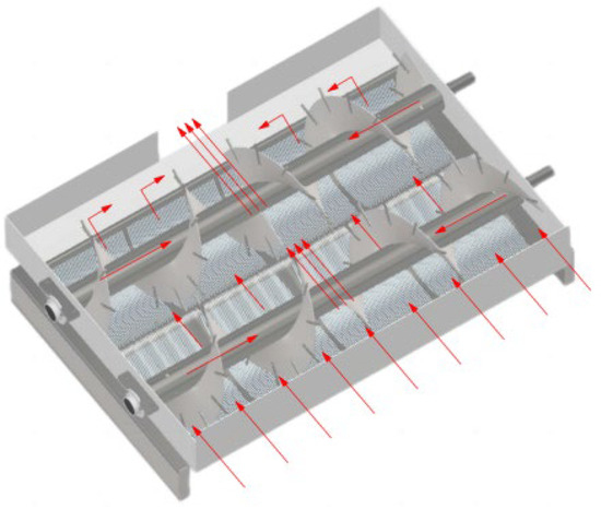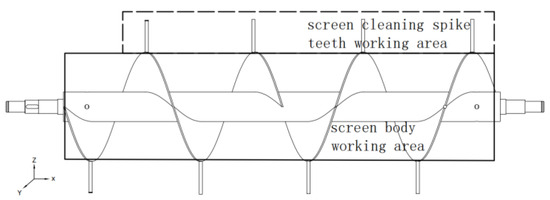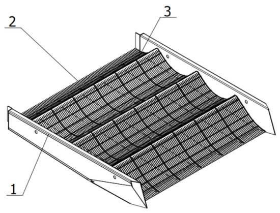 According to the structural form of five-stage screw conveyors, the front screen and back screen of the vibrating screen body were designed as multi-stage curved screens, and the screen body adopted the structural form of a grid screen, as shown in Figure 7. The effective working width was designed to be 1620 mm, and the pores of a single screen were 8 mm × 4 mm. According to the gaps between the screen-cleaning spike teeth and the screen body and the working length of the screen-cleaning spike teeth determined in the previous stage, the radius of the grid screen arc was designed to be 254 mm. Considering the large number, length and load of screen bars, stiffeners were provided to position the screen bars and improve the stiffness of the screen bars.