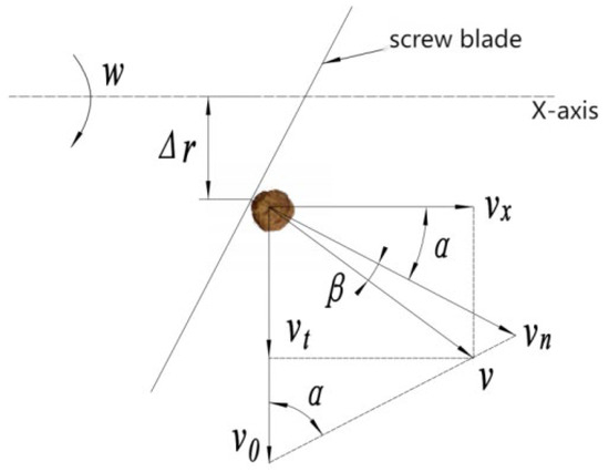 In the process of conveying the complex, the screw conveying shaft rotates around the X-axis at a constant velocity w. The motion state of the complex at a distance r from the center of the screw shaft and on the screw blade surface was analyzed. Under the push and pull of the screw blade, the complex exhibited variable motion. The velocity analysis is shown in Figure 5.