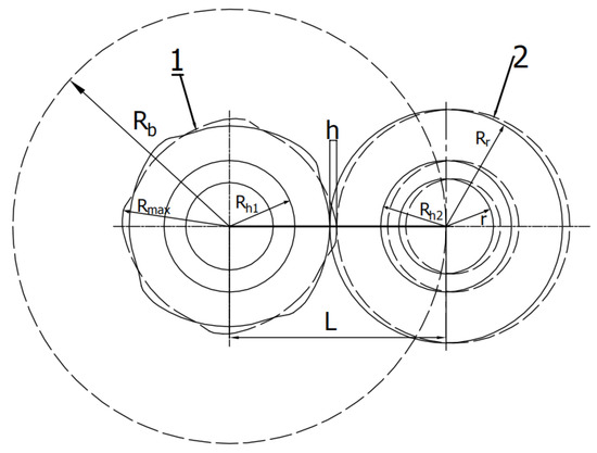 where —cam base circle radius, mm; —cam hub radius, mm; —radius of the exciting roller, mm; —radius of the exciting roller shaft, mm; —center distance between cam and roller center, mm; —maximum radius of convex profile, mm; and —roller hub radius, mm.