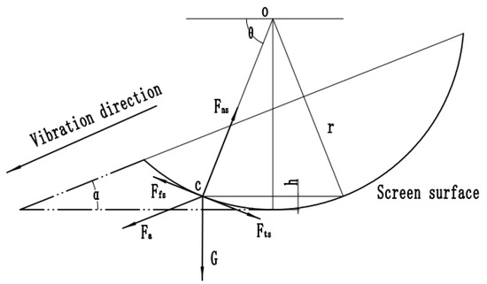 where Fns—normal component at point C of the arc surface for the force applied on the sand on the screen surface, N; Fa—inertia force of sand, N; G—gravity, N; θ—angle between the connecting line of point C on the screen surface, the circle center Os of the arc surface, and the horizontal line, rad; Fts—tangential component at point C on the arc surface for the force applied on the sand on the screen surface, N; Ffs—frictional force of sand on the screen surface, N; fs—friction factor of the screen surface against the sand; ms—mass of the sand, g; as—acceleration of vibrating screen, m/s2; r—arc surface radius of the vibrating screen, m; hs—vertical distance between sand at point C of the screen surface and the bottom of the arc surface of the vibrating screen, m; and Fs—resultant force on the sand, N.