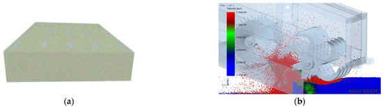 According to the tiger nut planting pattern on the sandy land and the overall working width of the harvester, a soil tank model was constructed in EDEM 2021.2 software. EDEM software is an advanced engineering simulation software that uses the discrete element method to simulate the particle flow, particle dynamics, and particle material interactions. It has many functions such as particle simulations, multi-physical simulations, visualization, and analysis. EDEM software is a powerful and widely used particle dynamics simulation software in the engineering field, and can help engineers and researchers better understand and optimize the behavior of particle systems. The software version used in this work is EDEM 2021.2. Multiple small squares were generated in the working area according to the tiger nut planting pattern parameters. Supposing each small square is a hole of a tiger nut plant, the location of the tiger nut–root–sand complexes was determined. Then, the tiger nut–root–sand complex and sand particle models established earlier were introduced so that sand particles could fill up the working area and bury and cover the complex. After the settlement of sand particles was complete, the soil tank model was finally established, as shown in Figure 10a. Solidworks three-dimensional software was used to simplify the conveying and separating device. The simplified model was saved in igs format and imported into EDEM software. The total simulation time was 12 s and the step length was 0.02 s. A simulation model was established, as shown in Figure 10b.