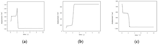 The X-axis direction is the direction of advancement along the screw shaft. As can be seen from Figure 12a and Figure 13a, during the movement of sand particles in the action area of the screen-cleaning spike teeth in the reverse direction of the X-axis, the displacement variation amplitude was small at within 0.25~1.70 s and increased between 1.70 s and 2.05 s probably because of the indirect contact between the screen-cleaning spike teeth and the sand particles. With the disturbance of the screen-cleaning spike teeth, the displacement of the sand particles under the applied force changed and the sand particles were discharged from the screen body gaps. After 2.55 s, the displacement in the X-axis direction no longer changed.