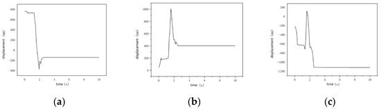 In the figure, the Z-axis is perpendicular to the ground, where the forward direction of the Z-axis is away from the ground and the reverse direction of the Z-axis approaches the ground. From Figure 12c and Figure 13c, it can be seen that the sand particles in the action area of the screen-cleaning spike teeth moved in the reverse direction of the Z-axis with the change in time, and the displacement variation gently decreased within 0.25~1.90 s, probably because there was still a sand layer between the sand particles and the surface of the screen body or the gaps of the screen body were blocked. With the movement of the screen-cleaning spike teeth, the structure of the sand layer was destroyed or the sand in the gaps of the screen body was cleared, and the sand particles were discharged to the ground through the gaps in the screen body. After 2.60 s, the displacement in the Z-axis direction no longer changed.