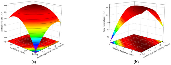 The analysis of the influence law of interaction term X2X4 on the evaluation indicator of the sand removal rate R1 is shown in Figure 15a. When amplitude X2 is 1.5 mm and the machine operation velocity increases from 0.6 km/h to 1.4 km/h, the sand removal rate shows a trend of a gradual increase. When the amplitude is 7.5 mm and the machine operation velocity increases from 0.6 km/h to 1.4 km/h, the sand removal rate shows a trend of first increasing then decreasing. It can be seen that when the amplitude is the largest, the sand removal rate can be increased by increasing the machine operation velocity.
