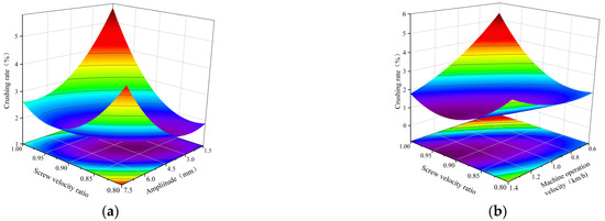 When the amplitude is 1.5 mm and the screw velocity ratio increases from 0.8 to 1, the crushing rate shows a trend of a gradual increase. Thus, it can be seen that when the amplitude is small, the crushing rate can be reduced by reducing the amplitude and screw velocity ratio. When the amplitude is 7.5 mm and the screw velocity ratio increases from 0.8 to 1, the crushing rate shows a trend of first decreasing and then increasing.