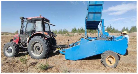 On this basis, with reference to the national standard GB/T5262-2008 [47] Measuring Methods for Agricultural Machinery Testing Conditions—General Rules and DB34/T 534-2022 [48] Technical Specification for Peanut Harvesting Mechanization, a field performance test was carried out in the 54th Regiment, the Third Division of Xinjiang Production and Construction Corps, as shown in Figure 18. The results showed that the conveying and separating device worked normally, and the average total loss rate was 1.8% and the crushing rate was 4.9%, meeting the design requirements.