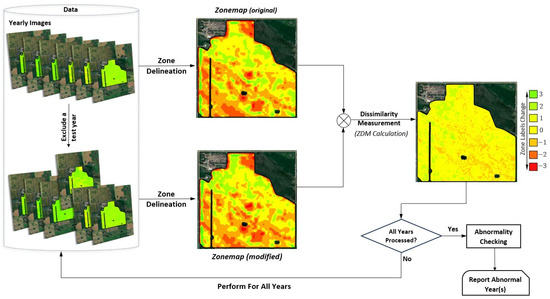 A depiction of the Abnormal Zoning Year(s) Detection Algorithmic Framework is outlined in Figure 2. A set of satellite image data of a field is taken as input for every individual year. In the initial stage of our framework, the zone delineation technique is applied to the input data for all years to obtain the original zonemap. Then, we exclude a test year and re-evaluate the modified or perturbed zonemap. Finally, we measure the change in the resulting zonemaps in two cases by calculating the Zoning Dissimilarity Metric (). Each year’s metric measures how much the zonemap changes by including that specific year’s data in the zoning process. The idea is that the data that abnormally perturb the zonemap correspond to non-normal years. To infer which year is abnormal, we assess the values, and if the relative dispersion of values is higher than a threshold, then the value(s) far away from other values is considered abnormal.