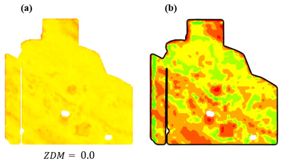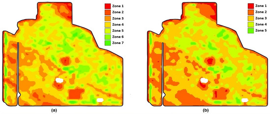- Zoning: Selected peak green images are normalized, and their scaled average serves as the input for delineating zones. We expected that the majority of points in the field would exhibit an average performance, and as they deviated from the mean performance value, the number of points was expected to decrease symmetrically. This pattern aligns with the characteristics of a normal distribution. Therefore, we established binning thresholds such that the zones’ areas conformed to a normal distribution. The zoning result is a zonemap assigning labels, from one to k, to each point in the field. The optimum number of zones is studied in [6,39]. Our method is flexible enough to use any zone number (i.e., any k). Figure 3 illustrates two zonemaps automatically created with our method for different zone numbers. Zonemap (a) results from the zoning function when , while zonemap (b) is the output when the zone number is decreased to .