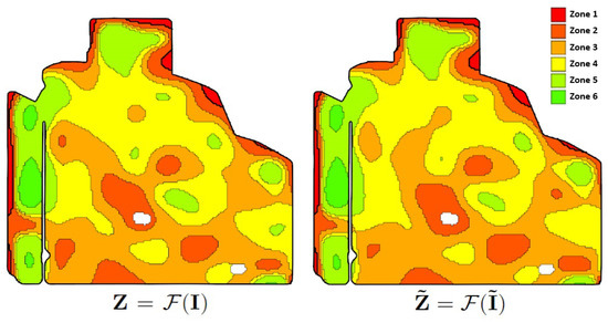 To elaborate, we initially set the number of zones, for example, . We let represent the collection of all peak green images we intended to use for zoning. For instance, we could consider as for the first year, as for the second year, and so on. Then, the zoning process was applied on . This process outputs a zonemap, referred to as , as illustrated in Figure 4, left. Modifying by adding or removing some of the images and applying the zoning function to the modified dataset results in , where is the modified dataset (see Figure 4, right). As visualized in the figure, alterations in the input to the zoning process cause shifts in some of the zone labels of pixels.