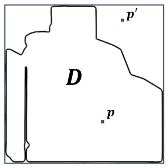 A field’s boundary: The area denoted by D shows the field. The square around the shape of the field is the bounding box. Point p is a pixel in the field’s boundary, and is a pixel out of the boundary. All out-of-boundary pixels are excluded in the calculations, i.e., Equation (4).