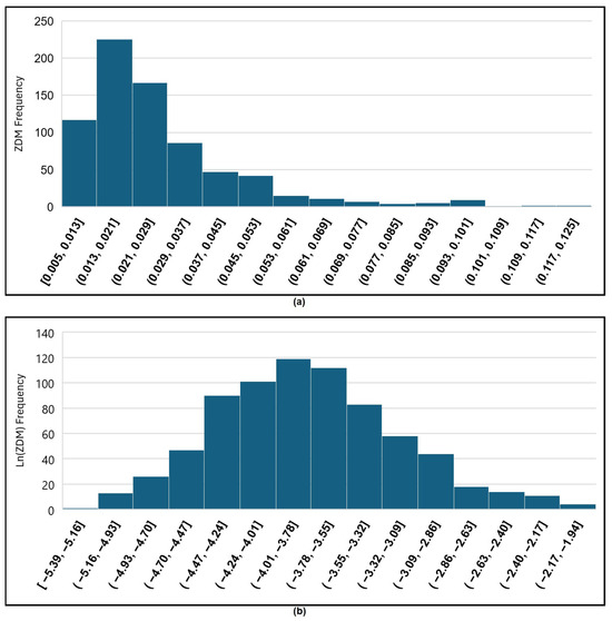 We need to establish a threshold for anomaly detection in all fields. Establishing a universal threshold for detecting abnormal zoning data can be challenging and requires careful consideration and analysis. The values for normal years are close to each other and are smaller than 0.02. We did not have enough data for each field. Therefore, we calculated values for all 39 fields in different cases and accumulated approximately 750 measured data points of values. The distribution of these values was revealed to follow a log-normal pattern, as illustrated in Figure 6a. The log-normal distribution is characterized by its right-skewed nature [42], wherein the transformation of values through the natural logarithm yields a normal distribution, , resulting in a dataset with a normal distribution (see Figure 6b).