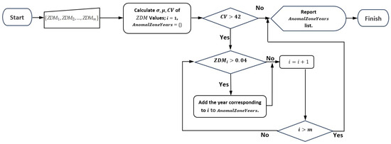 Based on the defined metric (), we introduce a framework for abnormal zoning year(s) detection, which is depicted in Figure 2. The input data consist of annual performance data. Initially, the is calculated for each year by excluding the data of that specific year. To compute the for the year d () using Equation (4), we use the notation , where . Then, the year(s) with higher values is considered abnormal based on some conditions we will discuss in the following.