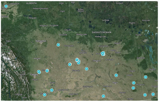 Our study areas were 39 selected fields from Canada, mainly in Alberta and Saskatchewan, and encompassed over 9000 acres. They experience a single growing season annually, resulting in only one peak green each year. In this study, we focused on six fields from the larger selection to provide detailed specifications. These fields are provided in Table 2. The table contains the fields’ ID, their boundary shape, the longitude and latitude of two points forming the bounding box of each field, the province where the fields are situated, and the area. The map in Figure 8 displays the spatial distribution of all 39 selected fields.
