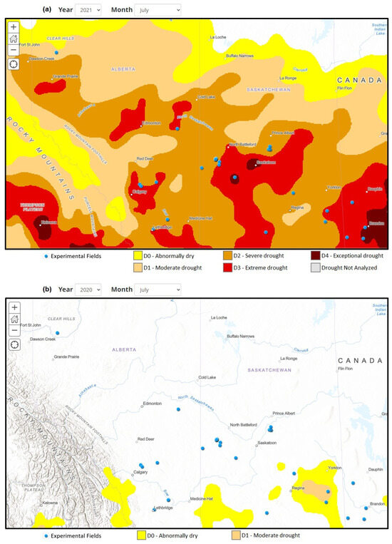 Canada Drought Monitoring [46]. (a) Drought conditions in July 2021, which was a drought year. (b) Drought conditions in July 2020, which was a normal year.