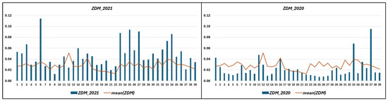 Figure 10 visually represents the values for all fields under experimentation for two consecutive years. As depicted on the left side of the figure, during the drought year of 2021, values for 87% of the fields surpass the mean. Conversely, on the right side of the figure, illustrating a normal year, 75% of the fields exhibit values below the mean.