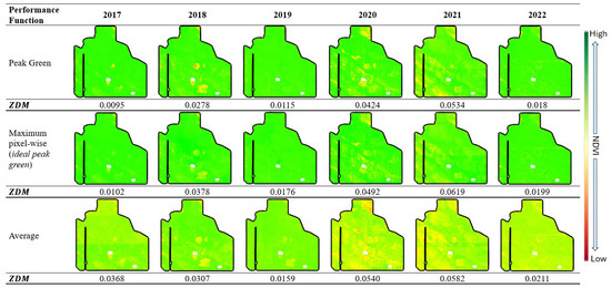 Historical data from satellite imagery and Normalized Difference Vegetation Index (NDVI) aggregation have been studied to estimate the performance of farm fields [7,8,9], and they have been used in many zoning studies [6]. In our experiments, we generated the performance indicator using historical NDVI data captured on the greenest day of each growing season and named them Peak Green. With one growing season annually, we obtained one peak green image yearly that was used as the growth indicator and included NDVI values at the peak day of each year [10]. To capture abnormal years, we introduced the Zoning Dissimilarity Metric (), which can capture the dissimilarity among peak greens. Using this metric, we could determine the abnormal years in terms of irregular changes in the zonemap.