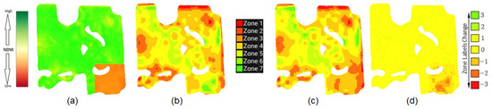 values are in , representing the degree of change in zone labels between two zonemaps. A value of zero indicates no change in zone labels, while a value of one signifies that all pixels’ zone labels have changed by the maximum possible amount. For example, in Table 1, one field’s zonemap is created in two cases using its annual performance data from 2017 to 2023. In the first row, column (c), 12% of pixels changed by one level and around 0.2% of pixels changed by two levels. The corresponding is 0.0256 in this case. In the second scenario, the labels of 20% of pixels are all changed by one level, resulting in a of 0.0396. As expected, the second row shows a larger change in that is properly zoning captured with the .