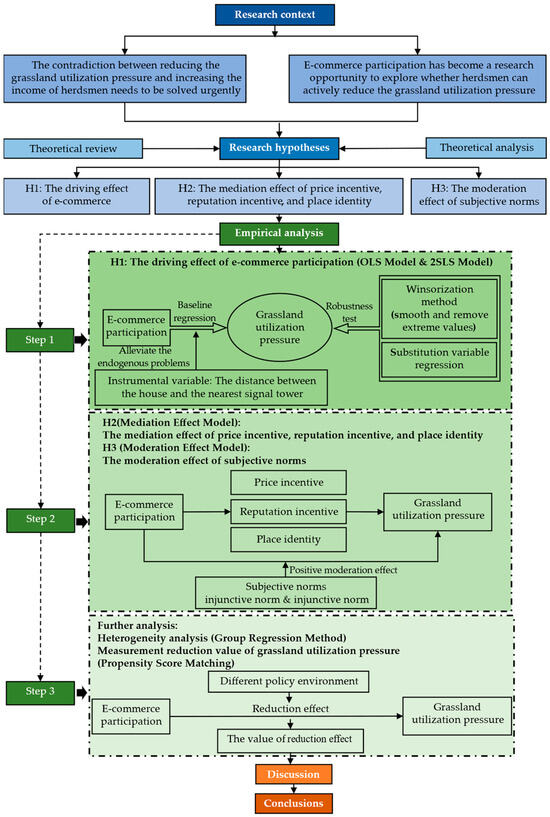 In summary, based on the perspective of grassland utilization pressure, this study focused on the field of animal husbandry, an important part of agriculture, and used micro-herdsmen data to further examine the impact of e-commerce participation on the pro-environmental production behavior of herdsmen. The causal relationship between the two was analyzed in terms of both theoretical and empirical aspects, which provides a meaningful reference for the development of animal husbandry in pastoral areas to take an environmentally friendly road. The study design of this paper is as follows. Section 1 is the introduction, which introduces the background of the topic. Section 2 presents the theoretical review and research hypotheses. Section 3 presents the collection and analysis procedures. Section 4 provides the analysis and discussion of the results. Finally, Section 5 presents the conclusions. The research framework is shown in Figure 1.