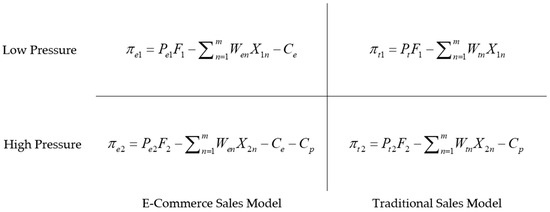 Situation 2: In the case of low-pressure grassland utilization, we compare the profits of the e-commerce and traditional sales models and assume that is constant. The type and quantity of production factors are and , and the selection equations of the sales models are as follows: