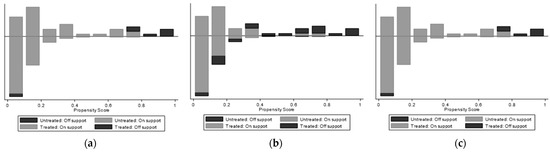 Table 3 reports the input–output features of participants and non-participants. Firstly, according to the choices of sales channels, the proportion of e-commerce participants selling livestock products was 15%, and the proportion of non-participants was 85%, which shows that the herdsmen in Inner Mongolia are relatively conservative, mainly using the traditional off-line sales mode to sell livestock products at present. Secondly, from the perspective of the breeding scale, the average herd scales of e-commerce participants and non-participants were about 302 and 443 sheep units, respectively. This initially reflects that herdsmen who do not participate in e-commerce have raised more livestock and are more likely to have higher pressure on grassland. Further, in comparing the input–output characteristics of e-commerce participants and non-participants, it can be seen that the average input of grassland scale was 12,022.56 Mu, and the average output value of each sheep unit was CNY 1231.93, which are higher than those of non-participants. This fact means that e-commerce participants have invested more grassland resources in livestock breeding, dispersed the unit grassland utilization pressure and produced higher values than non-participants.