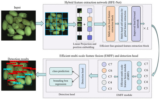 This section describes our proposed method for fine-grained cocoon recognition, whose overall flowchart is shown in Figure 3. We first introduce the proposed efficient hybrid feature extraction network (HFE-Net), followed by the efficient multi-scale feature fusion module (EMFF), and then the overall fine-grained cocoon detection network based on attention mechanism and multi-scale feature fusion (AMMF-Net).