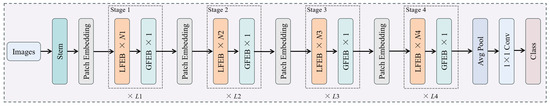 As we can see in Figure 4, the proposed HFE-Net consists of stem [24], a local feature extraction block (LFEB), and a global feature extraction block (GFEB). Among them, stem consists of a number of stacked 3 × 3 convolutions with a stride of 2 or 1, which are used to reduce the input image resolution and extract local information; LFEB is used for shallow feature extraction, which is more concerned with extracting texture detail features in local regions of the image; a GFEB is used for deep feature extraction, which is mainly used to extract the global information of the image. HFE-Net efficiently utilizes the advantages of both a CNN and Transformer, aiming to make full use of local and global information and maintain computational efficiency. Li et al. [25] pointed out that existing typical hybrid strategies (using convolutional blocks in the shallow stages and Tranformer blocks in the deep stages of the network) perform sub-optimally for dense prediction tasks (e.g., segmentation, detection, etc.). And inspired by their observation, the hybrid strategy adopted by our proposed feature extraction network involves utilizing both convolutional and Tranformer blocks at each stage of the network, which is a (N + 1)*L hybrid paradigm, and it can be seen in detail in Figure 4. We will describe the LFEB and GFEB in detail below.