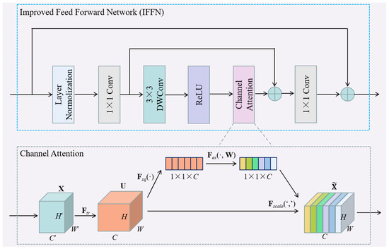 In this work, we proposed an improved feed forward network (IFFN), as shown in Figure 7, which can further improve the representation capability of the network. The IFFN mainly consists of a point-wise convolution, a depth-wise convolution, channel attention [27], a projection layer, and the necessary residual connections. The IFFN incorporates depth-wise convolution and channel attention, where depth-wise convolution is used to extract local information at a negligible computational cost, while channel attention adaptively learns the weights of each channel of the feature map, thus enhancing important feature channels and suppressing unimportant ones. Compared with a typical FFN, the IFFN can better capture the local and long-range dependencies of the feature map, thereby improving the performance of the model. And the IFFN can be formulated as follows: