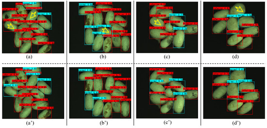 The visual results of the proposed AMMF-Net for cocoon detection. (a–d) are the detection results of the baseline, while the corresponding (a’–d’) are the detection results of the proposed AMMF-Net. The arrows indicate cocoons that were incorrectly predicted or not detected by the RetinaNet model.