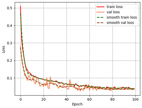 Furthermore, the variation in loss values during the training of AMMF-Net is shown in Figure 11. It can be observed that as the network is trained, both the training loss and validation loss gradually decrease and then converge to a small range of values. This phenomenon indicates that the model has not only learned effective feature representations on the training set but also possesses good generalization capabilities, achieving low error rates on the unseen validation set. The convergence characteristic of the model suggests that it has avoided overfitting, meaning it has not merely memorized specific samples from the training set but has learned general patterns that can be applied to new data.