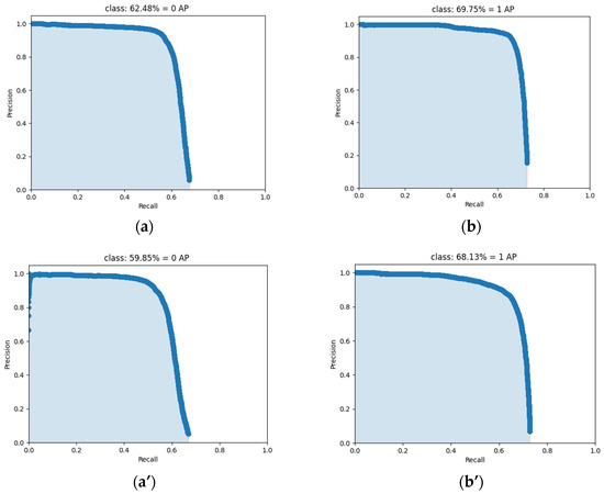 (a) PR curve of AMMF-Net for inferior cocoons, (b) PR curve of AMMF-Net for normal cocoons, (a’) PR curve RetinaNet for inferior cocoons, and (b’) PR curve of RetinaNet for normal cocoons.