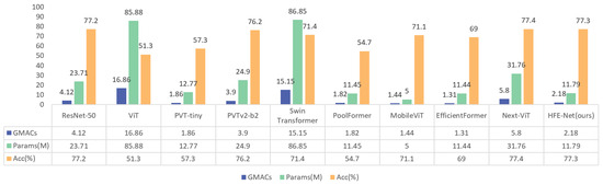 Ablation study of proposed HFE-Net. In order to verify the superiority of the proposed HFE-Net, a feature extraction network that combines the advantages of a CNN and Transformer, we compare the experimental results with those of other advanced feature extraction networks [12,16,18,25,38,39,40,41] such as ResNet, Swin Tranformer, and PVT on the publicly available dataset ImageNet-100. The experimental results are shown in Figure 13, where HFE-Net achieves comparable prediction results with other state-of-the-art feature extraction networks, with a prediction accuracy of 77.3%. However, its parameters and computational cost are only 11.79 MB and 2.18 GMACs, respectively, which shows that it significantly outperforms other networks and achieves the best accuracy–speed trade-off.