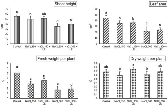 Experiments were carried out according to a completely randomized design with five treatments (control, 150 mM NaCl, 150 mM NaCl + LE, 300 mM NaCl, and 300 mM NaCl + LE) and four replicates for each experimental group. The statistical study was carried out using one-way ANOVA. Using Duncan’s test, significant differences were identified at p < 0.05.
