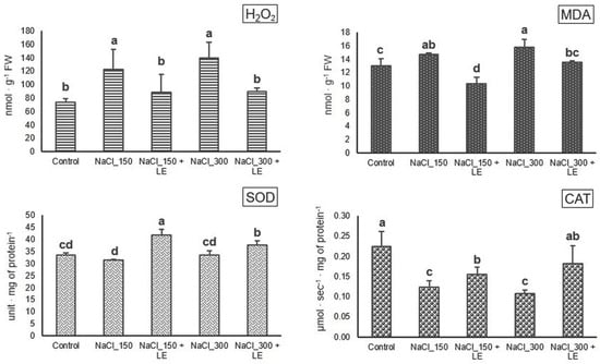 H2O2, MDA, and activity of superoxide dismutase (SOD) and catalase (CAT) determined in maize samples grown in salinity and treated or not with LE. Different letters are statistically significant according to Duncan’s multiple comparison test (p < 0.05).