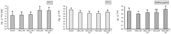 Total phenols (TPC), flavonoids (TFC), and anthocyanin content detected in maize samples grown in salinity and treated or not with LE. Different letters are statistically significant according to Duncan’s multiple comparison test (p < 0.05).