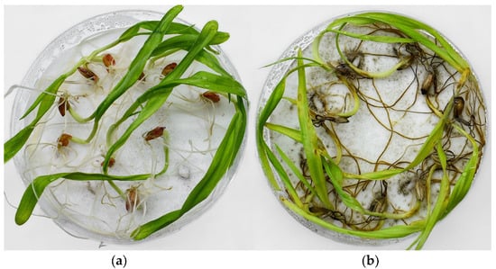 (a) The symptomless (F + SAP treatment) and (b) symptomatic (SAP treatment) plants in the Petri dish test of cv. Bojos after the infection with B. sorokiniana.