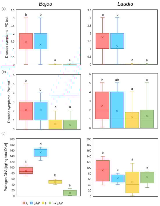 Disease symptoms of B. sorokiniana in (a) Petri dish test with seeds of cv. Bojos and Laudis infected by conidial suspension of the pathogen, evaluated 10 days after infection by the 5-point rate scale (0 = no symptoms, 4 = full infection), (b) disease symptoms on juvenile plants grown 3 weeks in infected soil in the pot test, evaluated by the 6-point rate scale (0 = no symptoms, 5 = full infection), and (c) amount of the pathogen DNA in pg per 1 ng of the total DNA isolated from plants in the pot test; C—untreated seeds, SAP—polymer-treated seeds, F—seeds treated with fungicides, and F + SAP—combined treatment. Data marked with the same letter were not statistically different by the LSD test at α = 0.05.