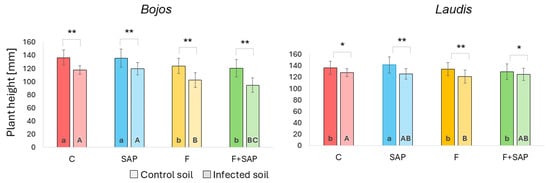 Plant height of cv. Bojos and Laudis in control soil and soil infected by B. sorokiniana; C—untreated seeds, SAP—polymer-treated seeds, F—seeds treated with fungicides, and F + SAP—combined treatment. Columns marked with the same letter were not statistically different by the LSD test at α = 0.05; the test was performed separately for the control (lowercase) and infected soil (uppercase). Pairwise comparisons of plant height between the control and infected soil of each seed variant were made by t-test, α = 0.01 (*) or 0.001 (**).