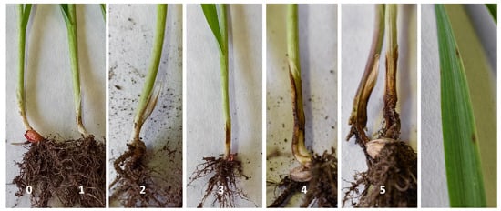 Disease symptoms were observed on 76.3 and 76.6% of untreated plants of cv. Bojos and Laudis, while for SAP-treated seeds, it was 75.5 and 62.6% of plants, respectively. In pesticide treatments (F or F + SAP), 30–36.6% of Bojos and 53.3% of Laudis plants were symptomatic. The average disease symptom intensity evaluated by the 6-point rate scale (Figure 4) was weaker on fungicide-treated seeds without a statistically significant impact of SAP in both cultivars (Figure 2b). Seeds not treated with fungicides were more severely affected. In cv. Bojos, the differences between fungicide-treated seeds and seeds without fungicides were statistically significant; in addition, disease symptoms were also observed on plant leaves (1–3 small spots) in variants not treated with fungicides (F or F + SAP). More plants with symptoms on leaves (46.42%) were found in the control variant compared to those treated with SAP (24.14%). In cv. Laudis, plants from seeds treated with SAP alone did not show statistically different symptom intensity from untreated (control) seeds or fungicide-treated seeds (Figure 2b). Thus, plant infestation here was slightly lower than in control seeds but higher than in fungicide-treated seeds (Figure 2b).