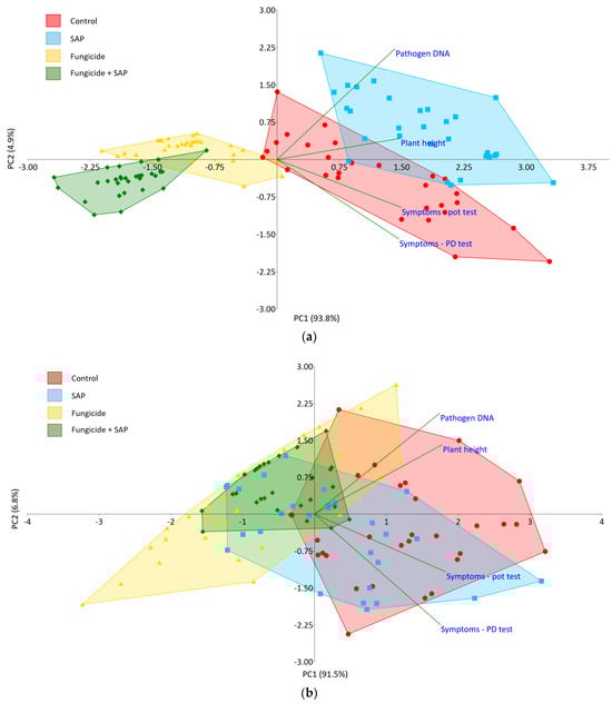 Based on PCA and principal component 1 (PC1), evaluated parameters such as plant height, disease symptoms in Petri dish and pot tests, and the amounts of pathogen DNA were positively correlated with samples of control and SAP variants in cv. Bojos (Figure 5a). In contrast to the previous two variants, the samples from fungicide and fungicide + SAP variants of this cultivar were negatively correlated with these parameters based on PC1 and showed lower variability within their treatment. However, there is a clear differentiation of individual variants and subtle overlaps of a few samples between pairs of control and SAP variants, as well as fungicide and fungicide + SAP variants. In the case of the cv. Laudis, the distribution of samples according to variants was ambiguous (Figure 5b). Only the samples of the control variant (except for one sample) had a positive correlation with the evaluated parameters according to PC1. The samples from other variants were located in the middle of the PCA plot without a clear distinction. Using PERMANOVA, a statistical comparison of the values from all principal components from PCA showed strong significant differences between all variants in the cv. Bojos. In the cv. Laudis, PCA shows no statistically significant difference between fungicide and fungicide + SAP variants (Table 1).