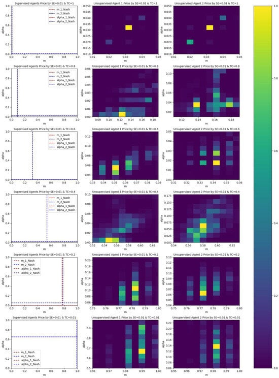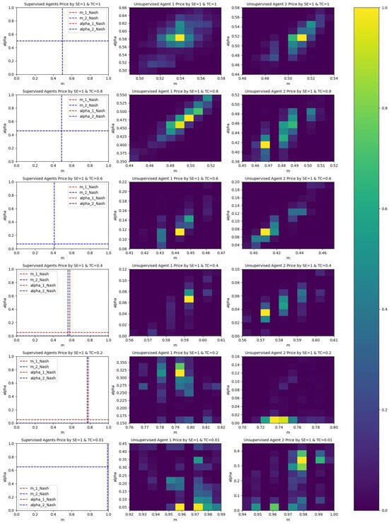 The middle and the right-side panels of Figure 1 and Figure 2 demonstrate the frequency of variable combinations obtained by unsupervised competitor agents. The lighter a point within the m-α plane, the more frequent the variable combination is observed as the outcome of the game by unsupervised agents. The points outside of the depicted minimum and maximum of the m-α plane are non-observed pricing policies in the final steps of the agents’ interaction.
