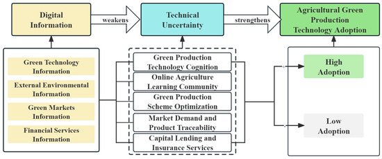 In summary, digital information significantly influences farmers’ adoption of ecological agricultural technologies by promoting technological cognition, information sharing, production monitoring, market channels, product traceability, and financial services, as illustrated in Figure 1.