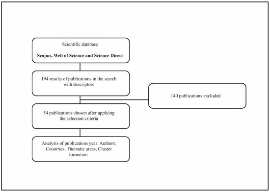 In the initial search, a total of 194 publications were identified (Figure 1). However, to create the bibliographic portfolio, the articles were filtered based on their titles and abstracts. Using the exclusion criteria, 140 articles were excluded, resulting in a final selection of 54 articles for this review.