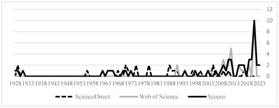Comparison of the number of articles published on hop downy mildew in the Scopus, Web of Science, and ScienceDirect databases from 1928 to 2023.