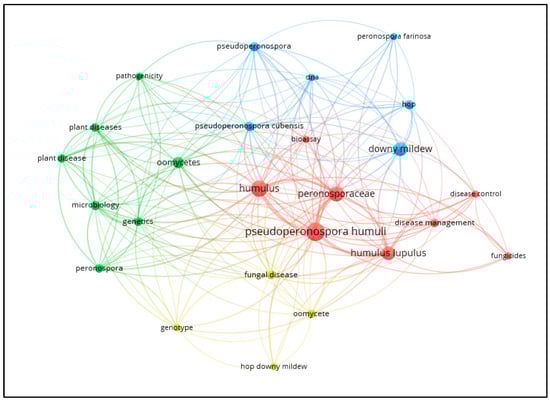 The co-occurrence analysis of keywords revealed three distinct clusters on the map. The first cluster, represented in red, is centered around keywords such as “Pseudoperonospora humuli”, “Peronosporaceae”, and “Humulus”, which are related to the biological classification of downy mildew and hop. This cluster likely includes studies that specifically focus on the taxonomy, classification, and characteristics of Pseudoperonospora humuli and its relationship with the Peronosporaceae family and Humulus genus.